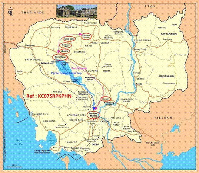 par la route (314 Km et 6h00 de trajet) ou par le fleuve Tonl Sap avec